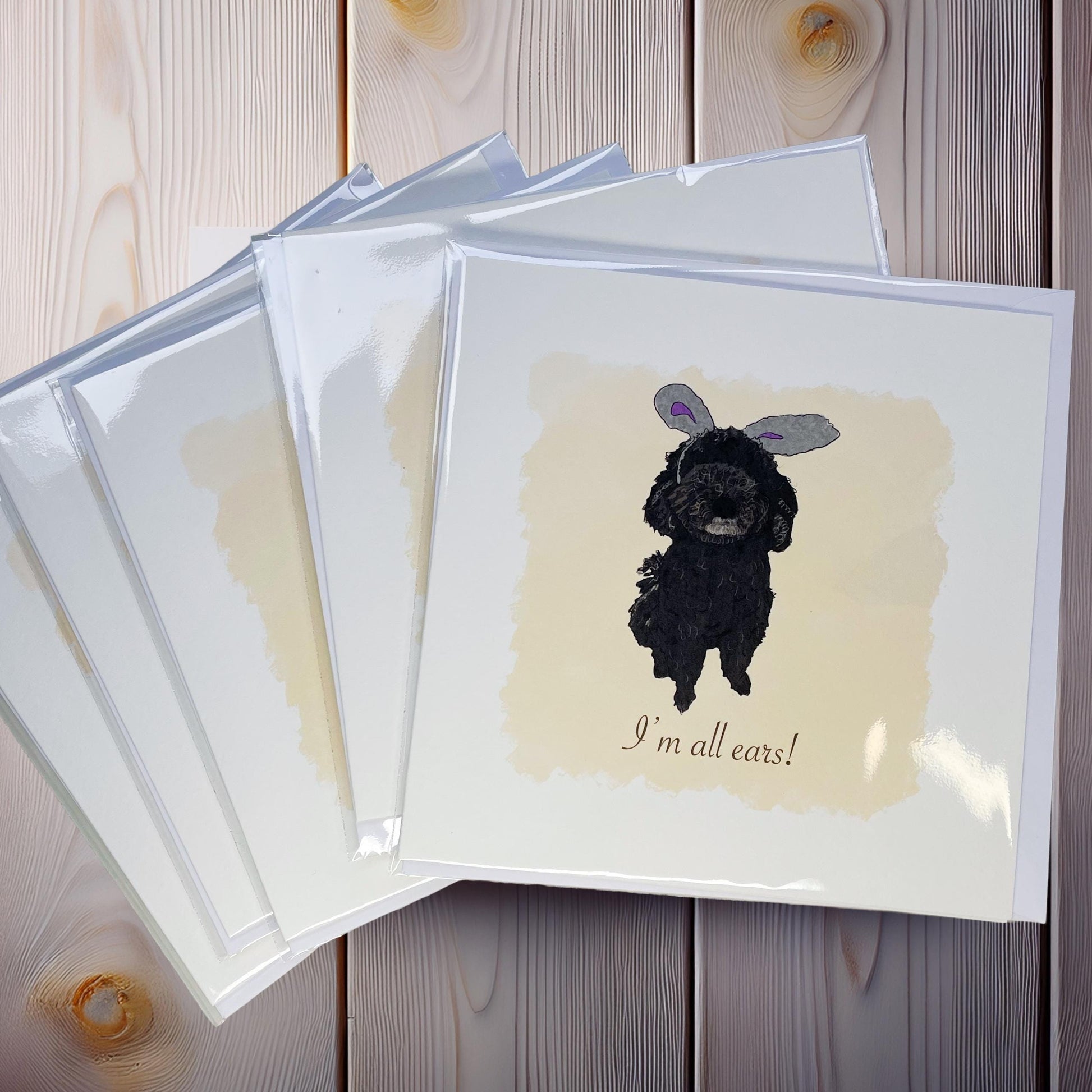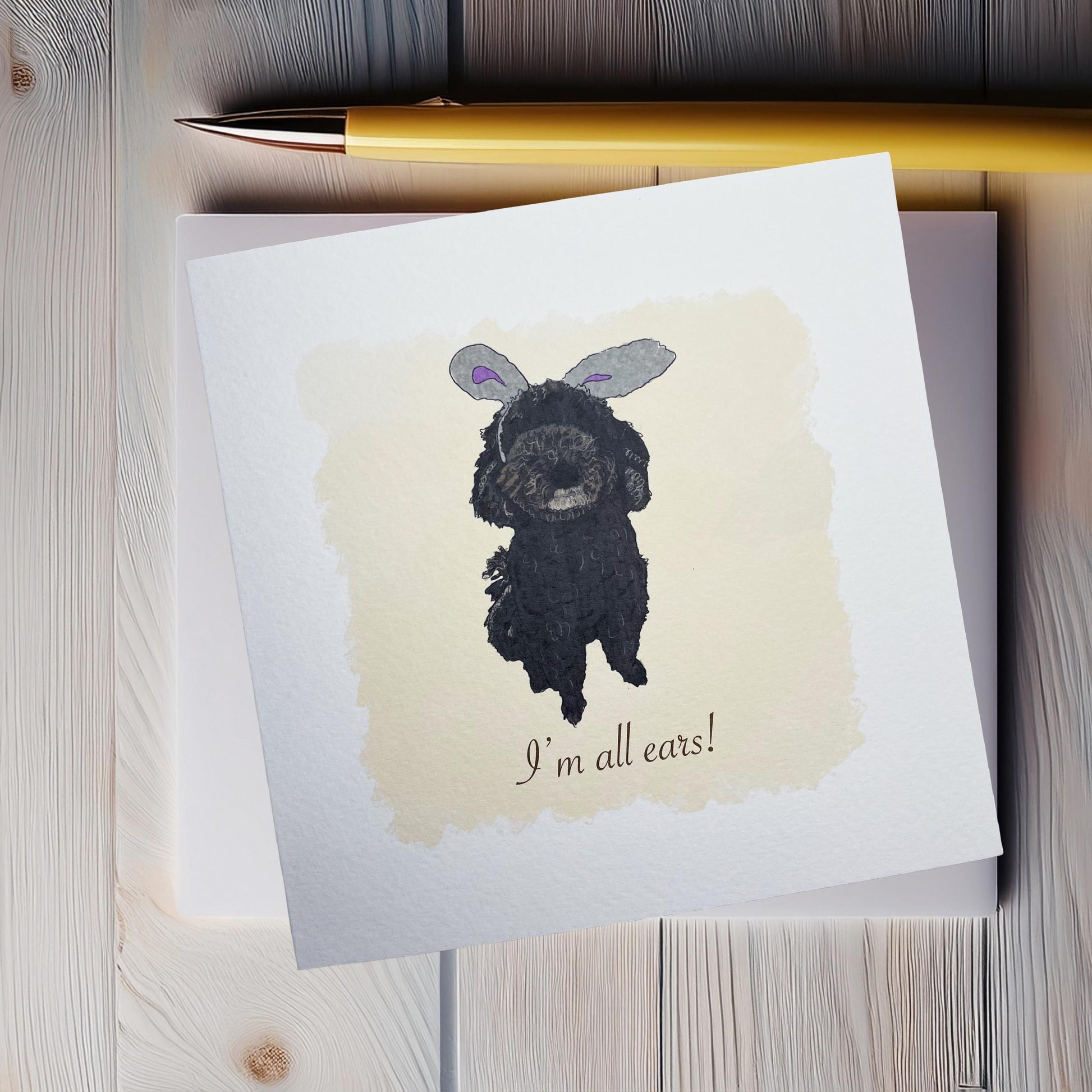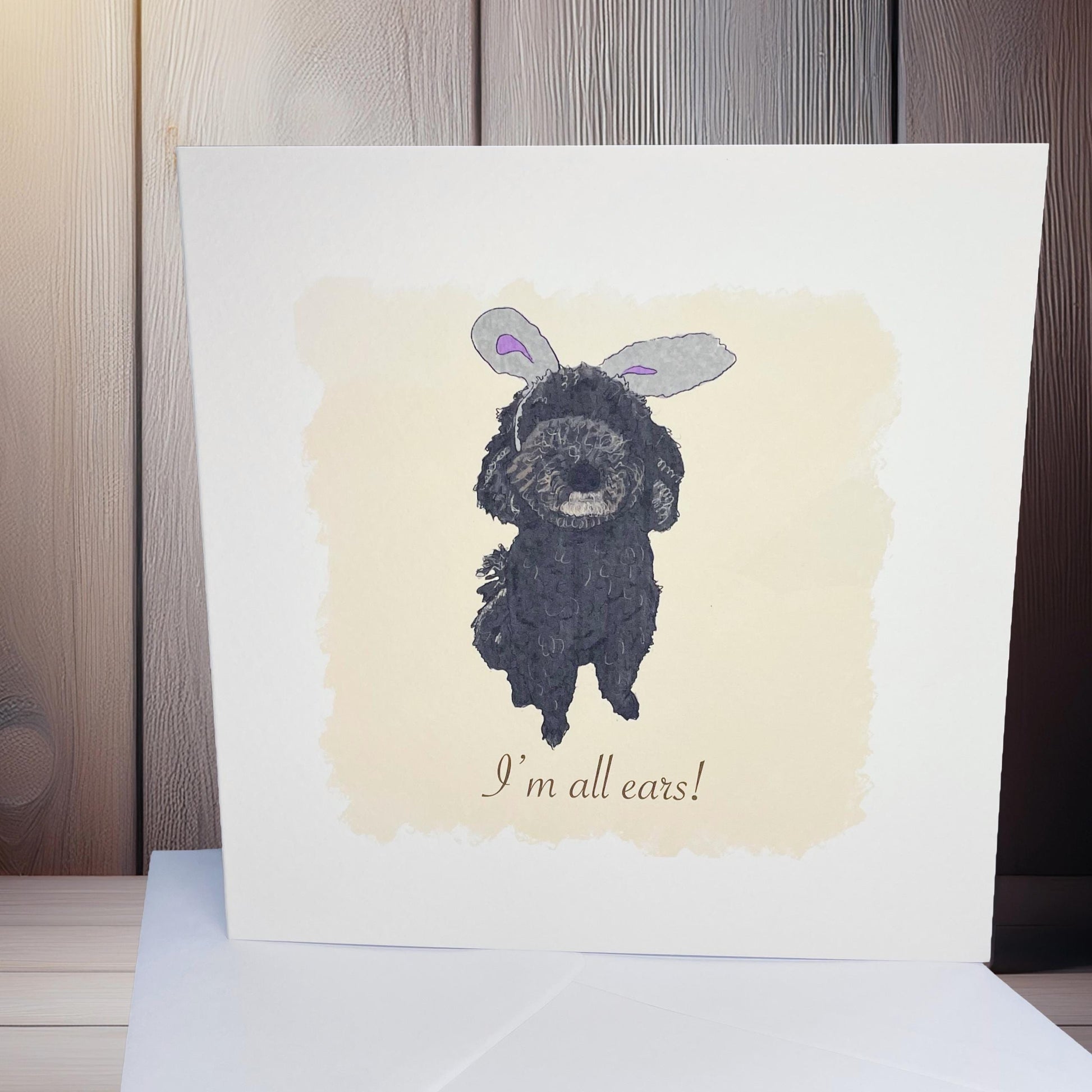 A beautiful and quirky card for Easter or just because! This luxury card features one of our beautiful dog characters – the miniature Poodle! Of course, he is dressed up in his best outfit to celebrate! Perfect for dog lovers.