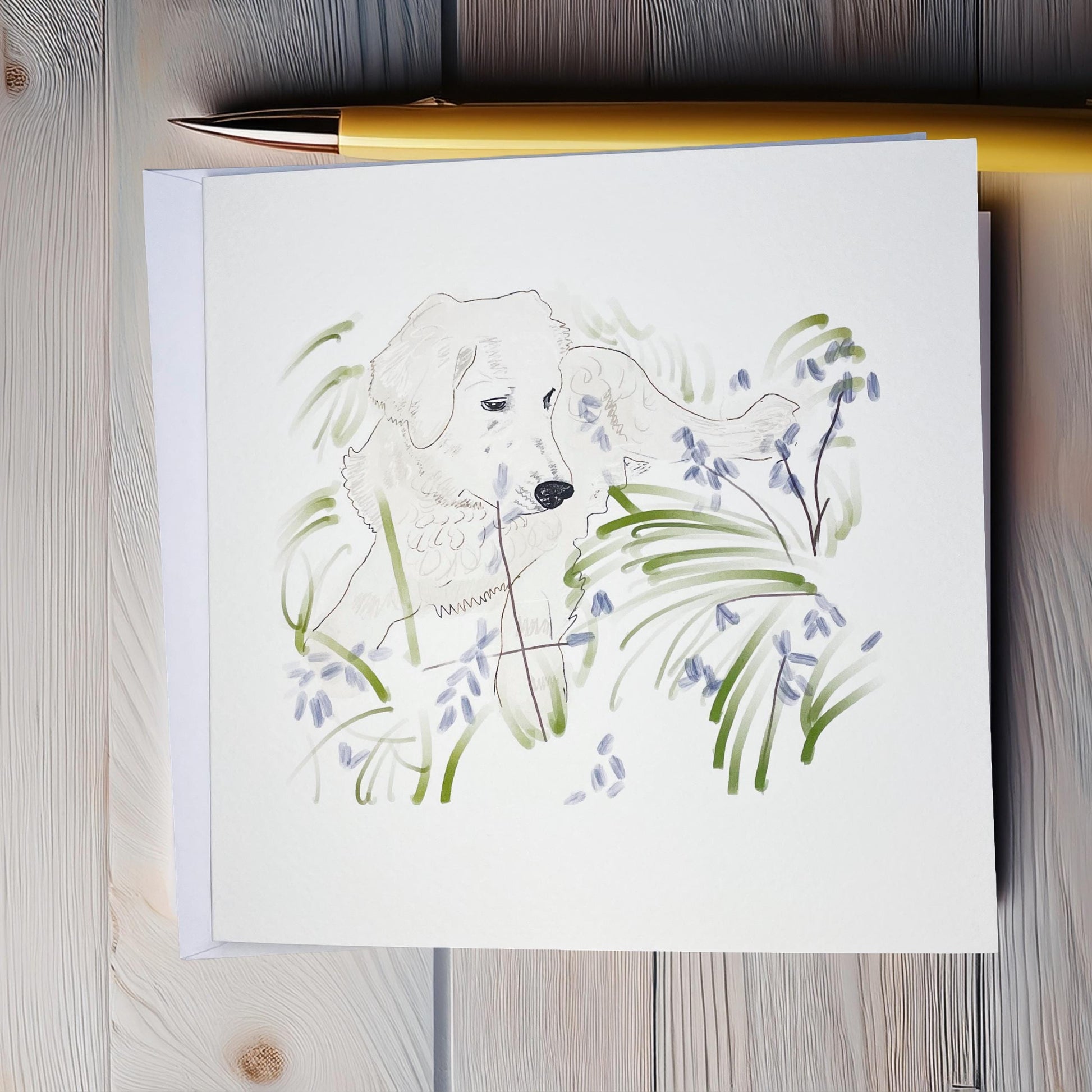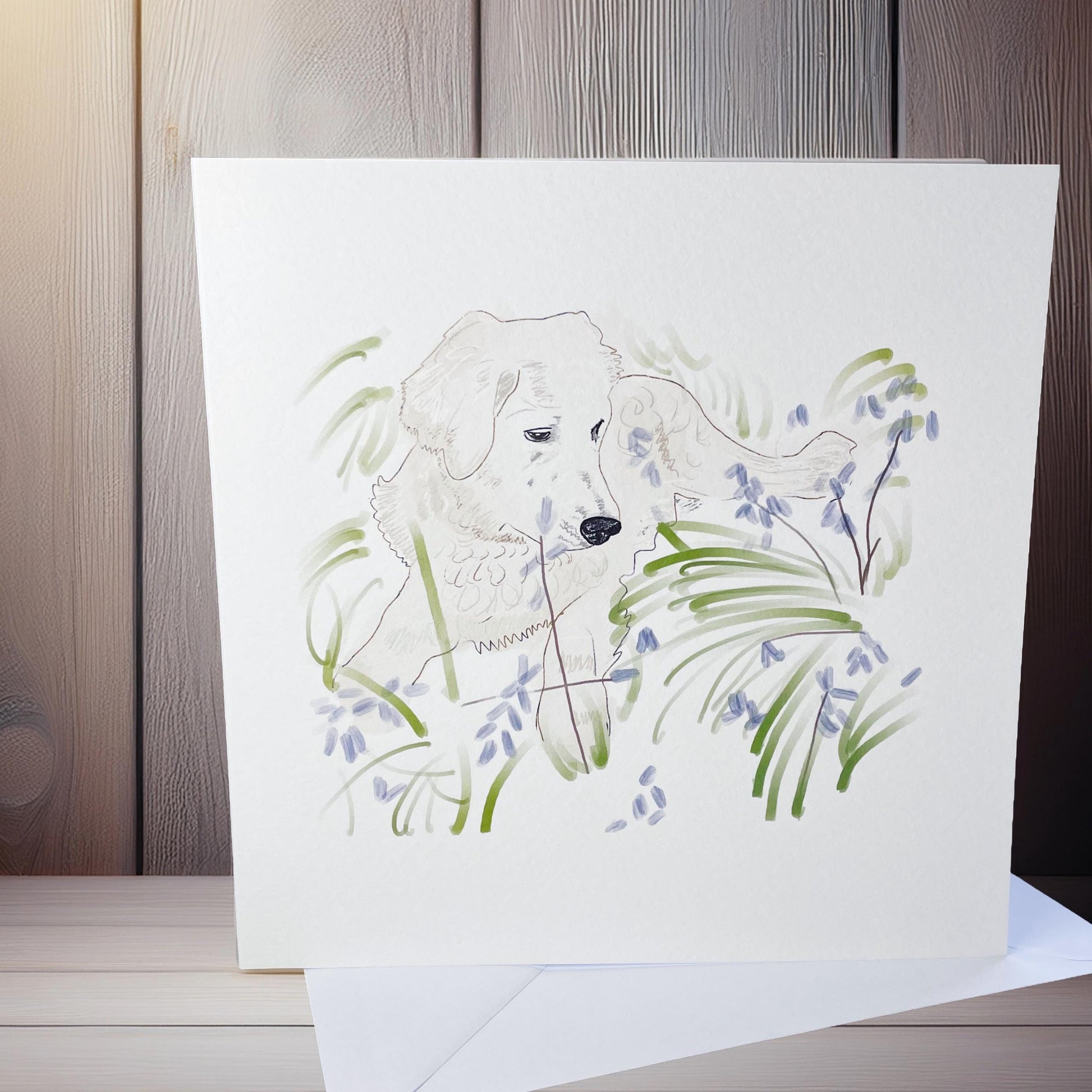 Luxury card for any occasion. Featuring one of our beautiful dog characters – the Golden Retriever! Perfect for dog lovers. Cards are printed on tinteretto gesso card. This textured, off-white surface gives a hand-drawn feel to the print. Blank for your message. Each card includes a white envelope for posting.